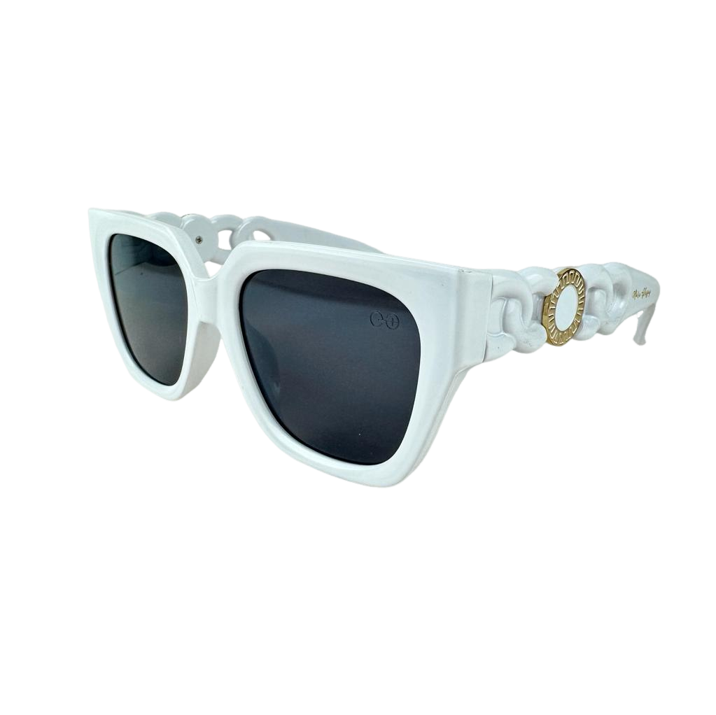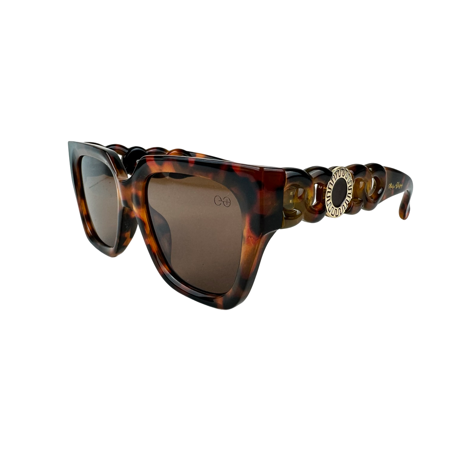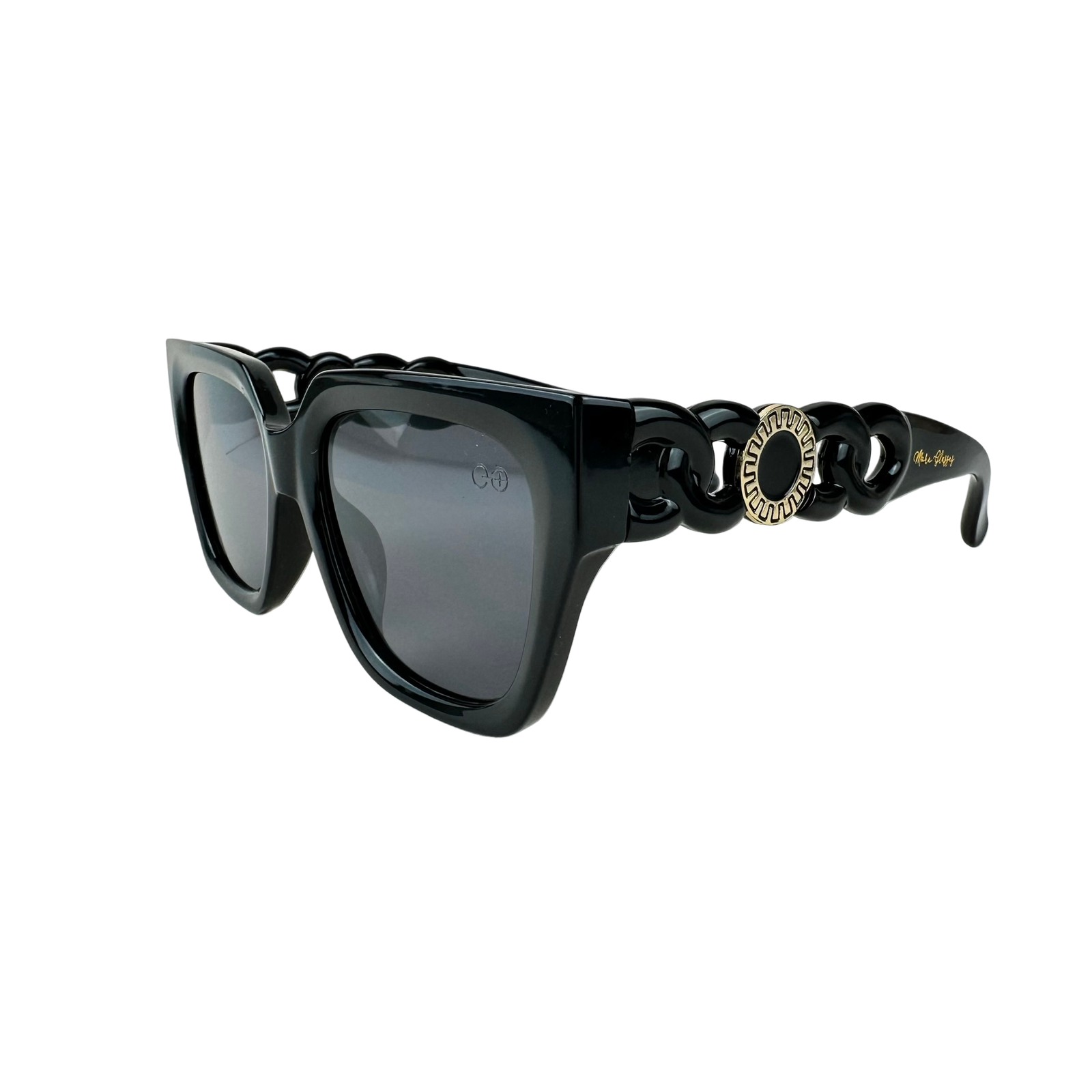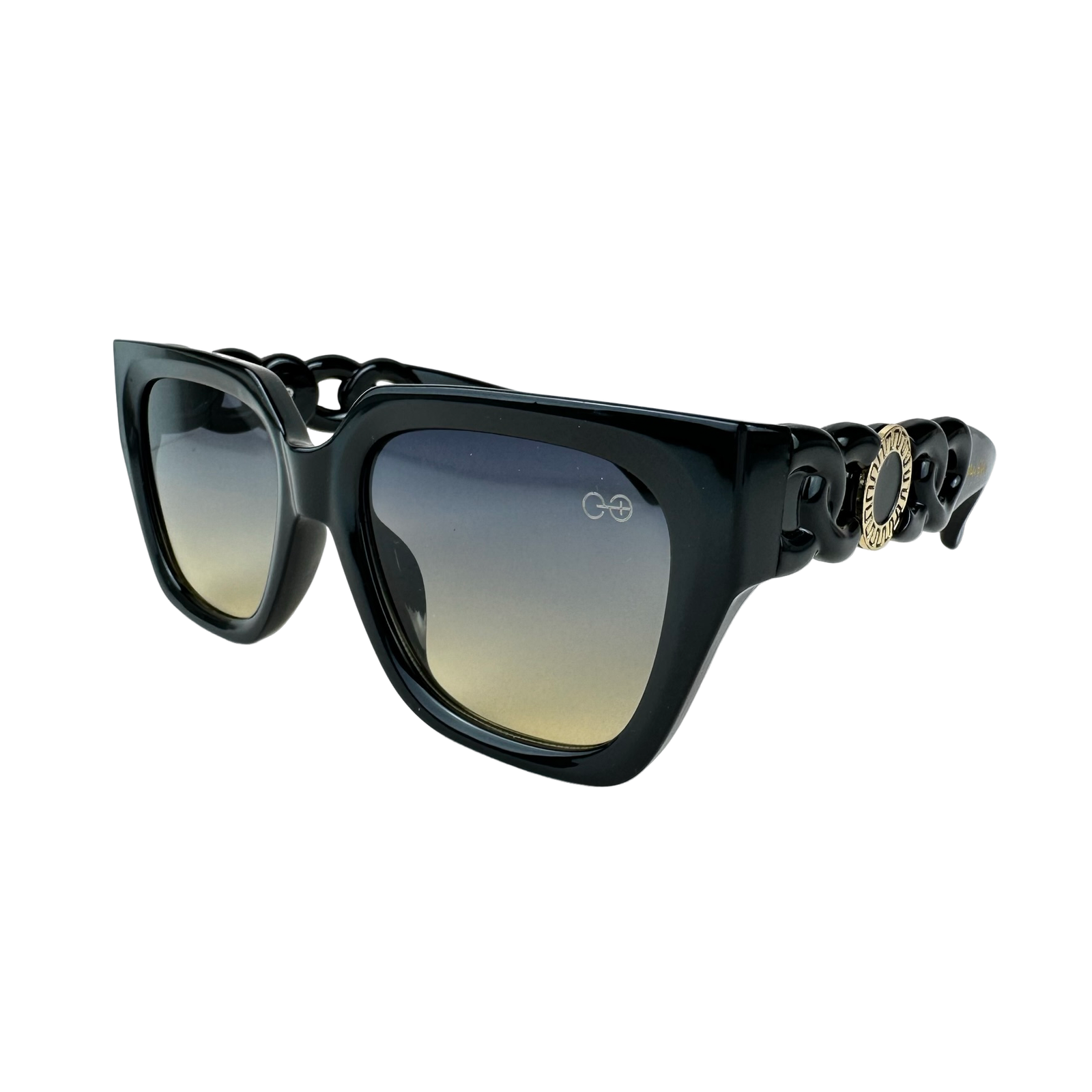 É UM ÓCULOS DE SOL FEMININO EM ACETATO MODELO QUADRADO COM HASTES MAIS LARGAS EM FORMATO DE CORRENTE COM DETALHE EM METAL DOURADO.