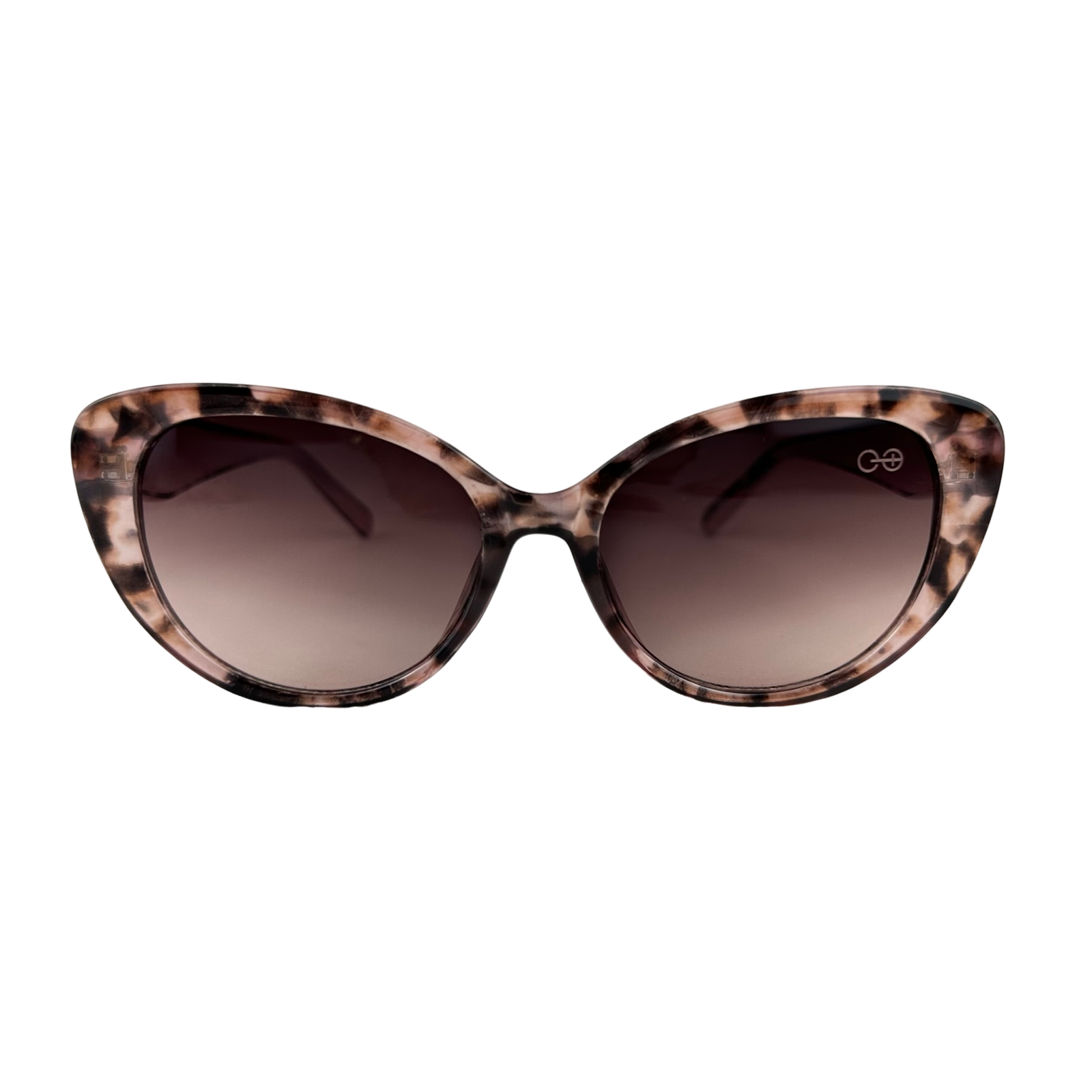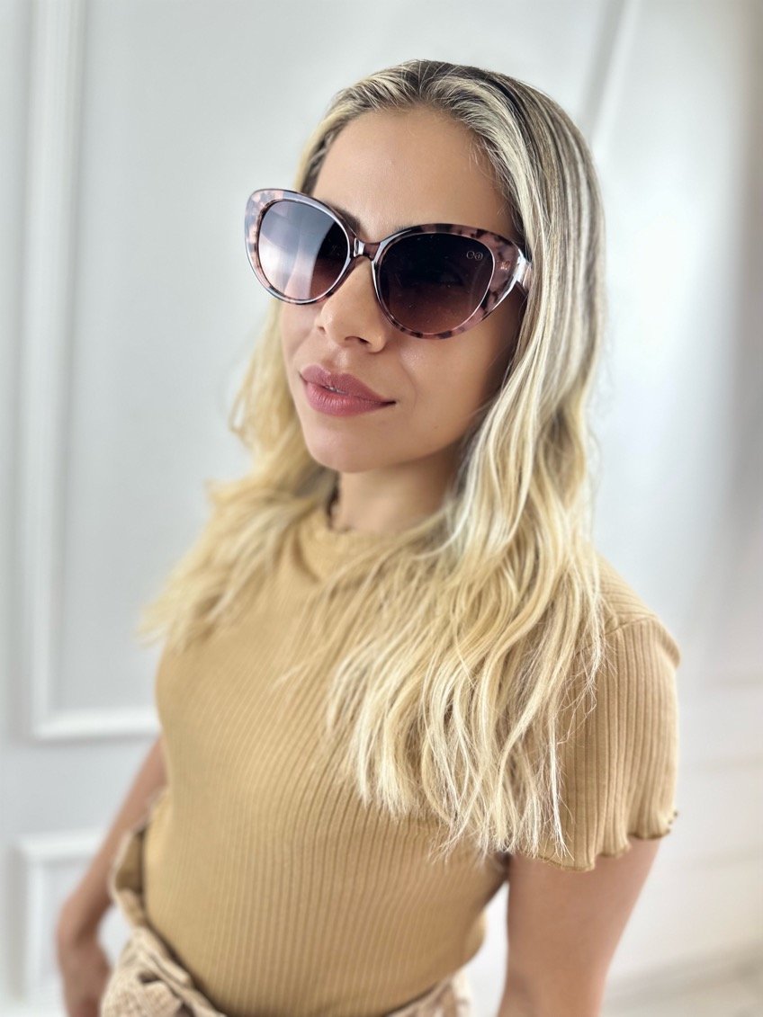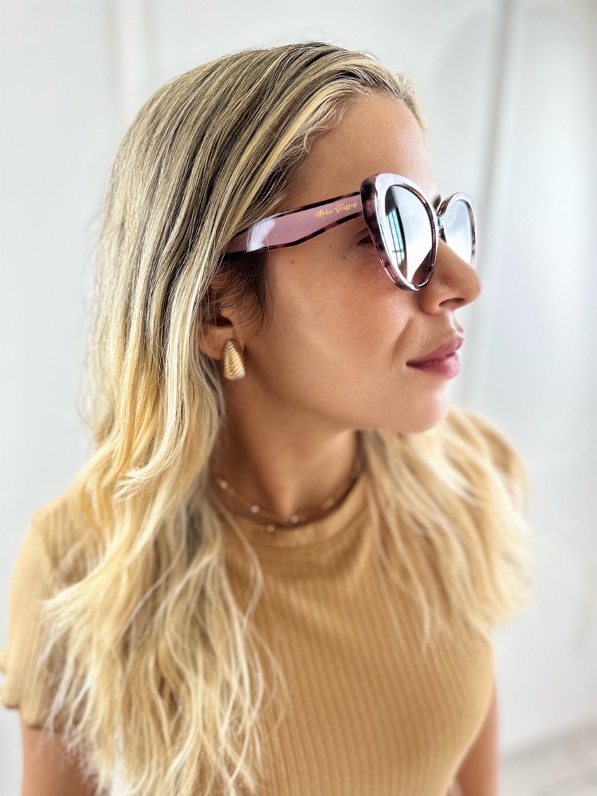 É UM ÓCULOS DE SOL FEMININO EM ACETATO MODELO CAT EYE (GATINHO) NA COR TARTARUGA ROSADO COM HASTES NA COR ROSÊ.