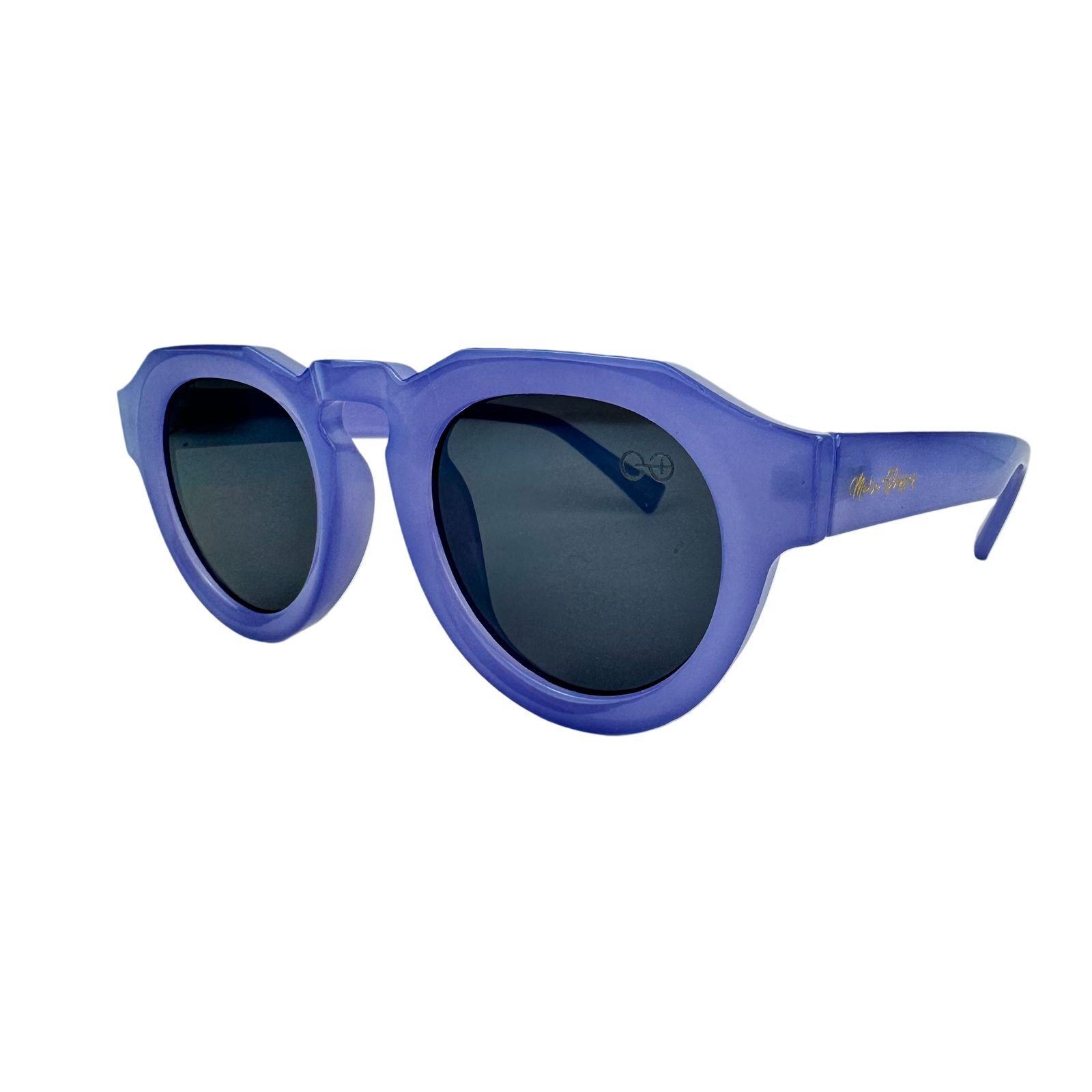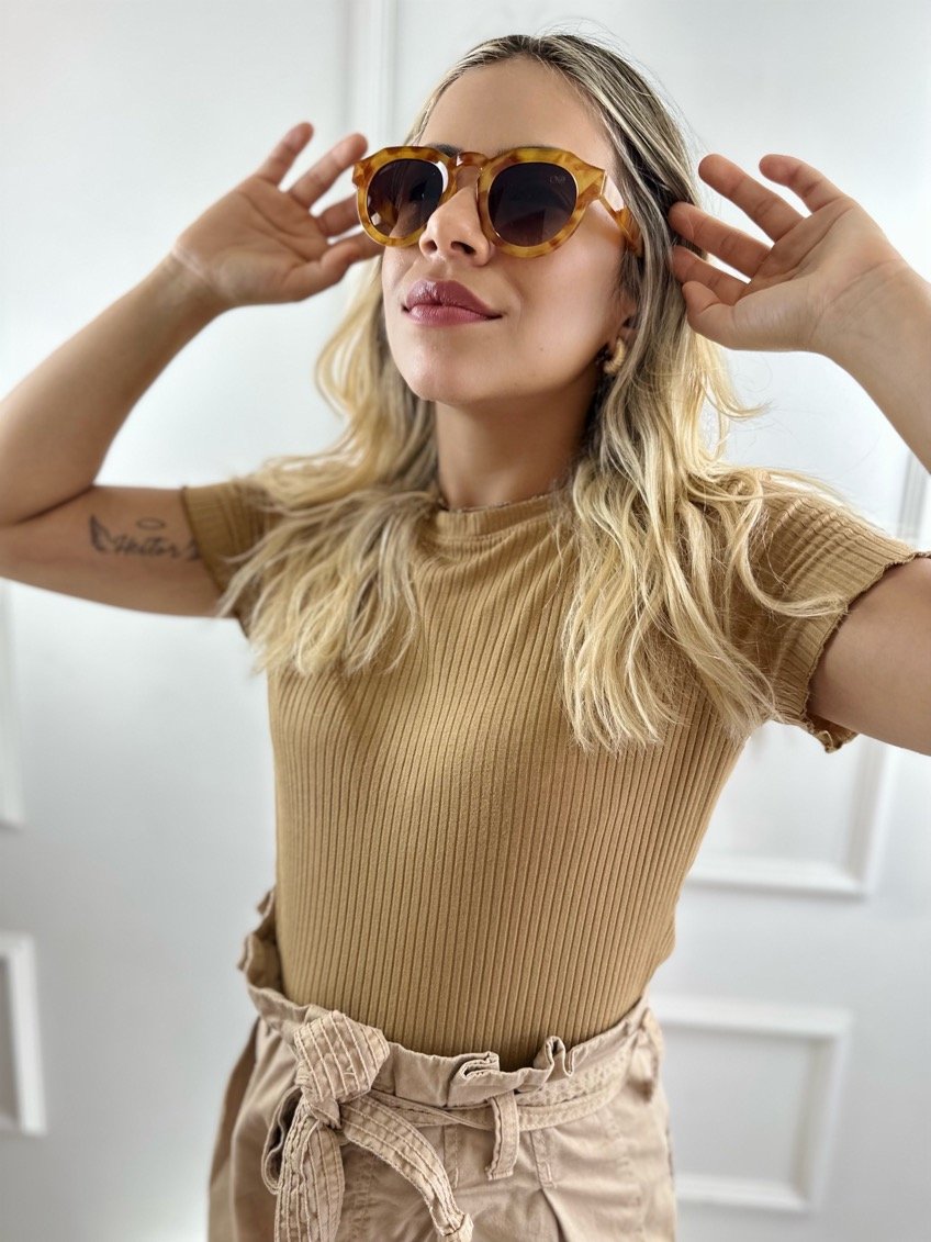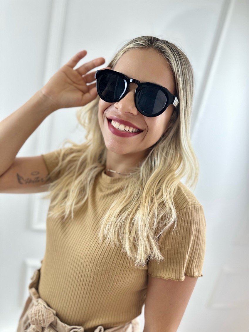É UM ÓCULOS DE SOL FEMININO EM ACETATO MODELO REDONDO COM ARO MAIS GROSSO E BASE RETA NA PARTE SUPERIOR.