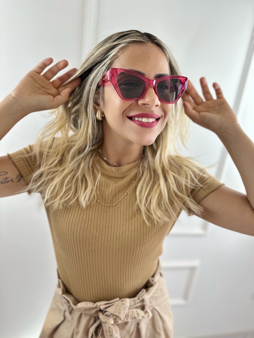 É UM ÓCULOS DE SOL FEMININO EM ACETATO MODELO CAT EYE (GATINHO).